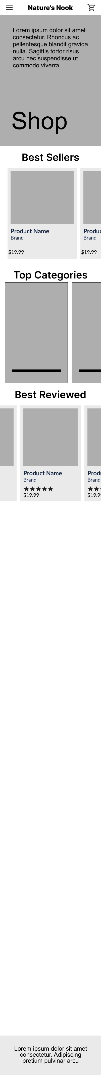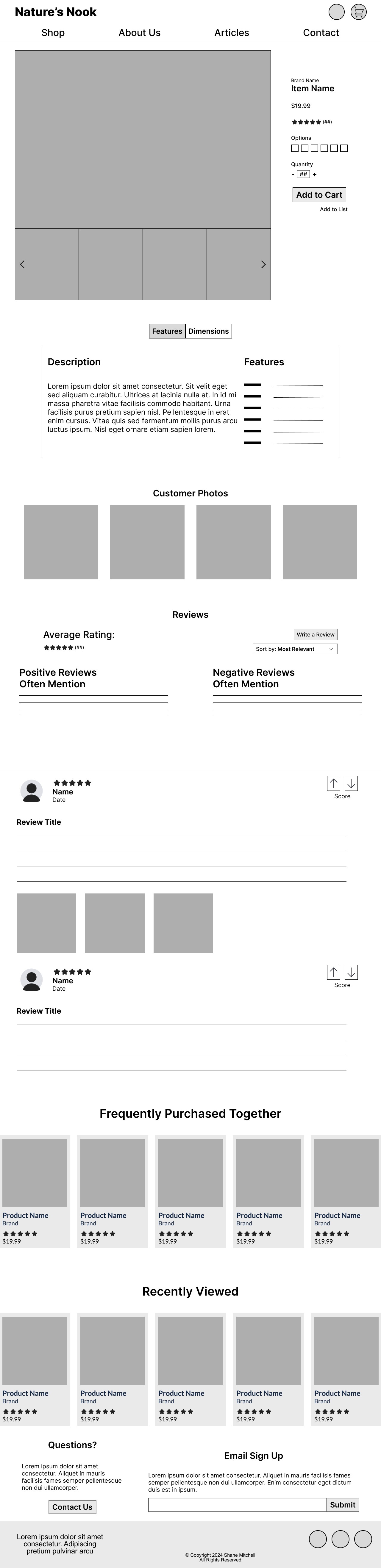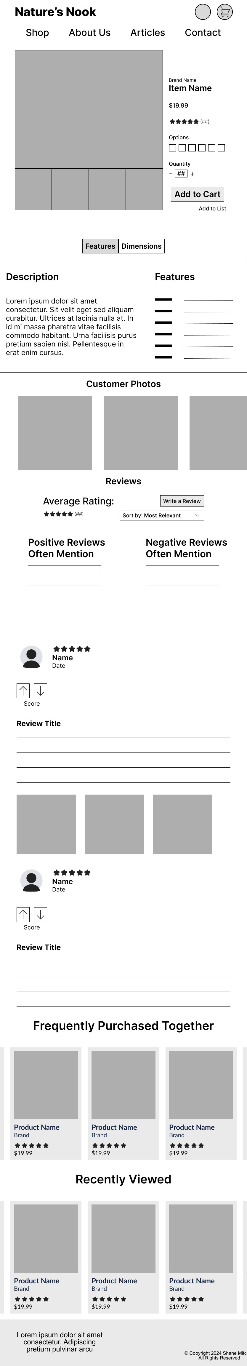 While conducting research, I found that users are more confident in completing a purchase when there is plenty of information for each item as well as reviews from other buyers. With that knowledge, I included a section for reviews and customer photos to increase conversion and prevent cart abandonment.