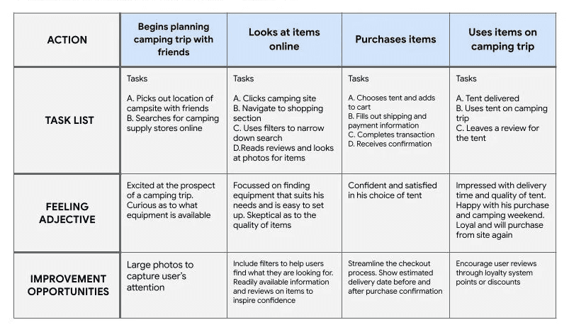 Putting myself in James's shoes, I went through the steps of researching and ordering an item from a camping website and noted down my thoughts during each step.