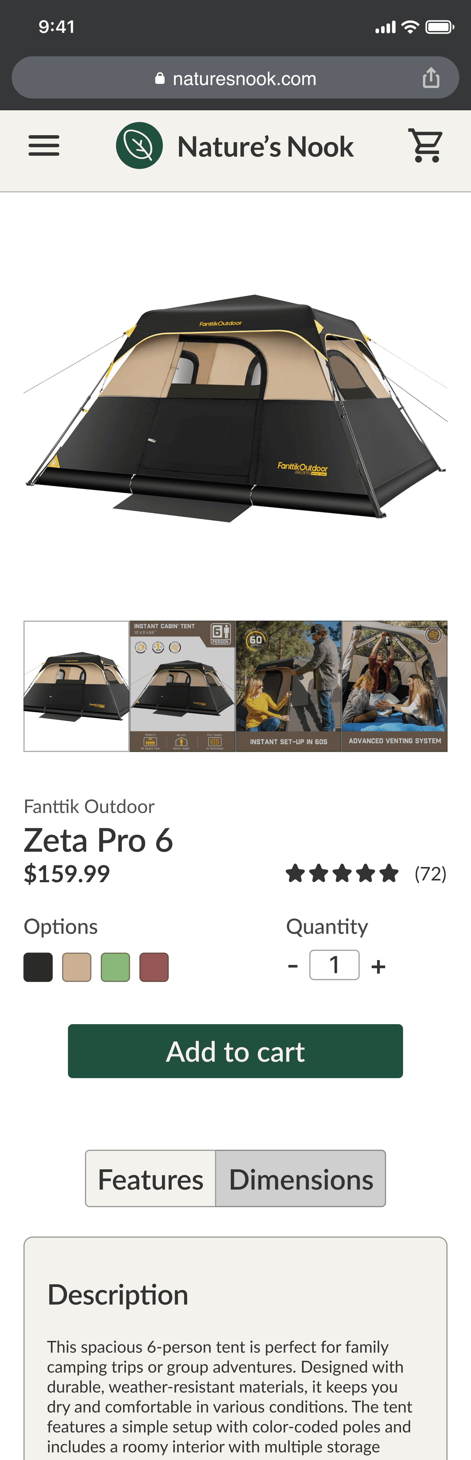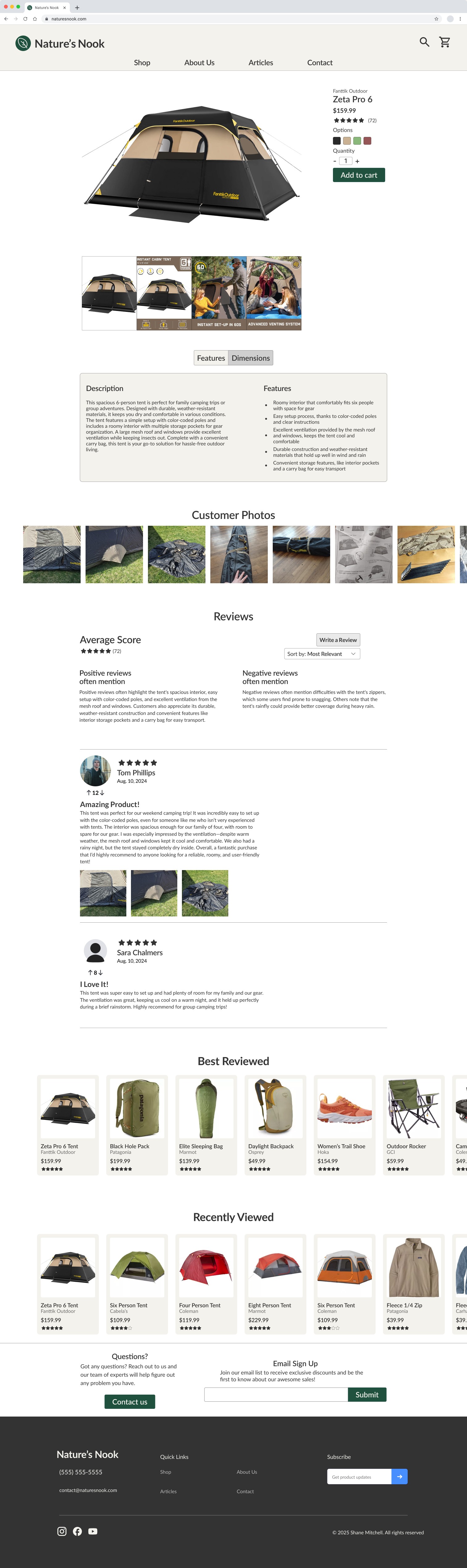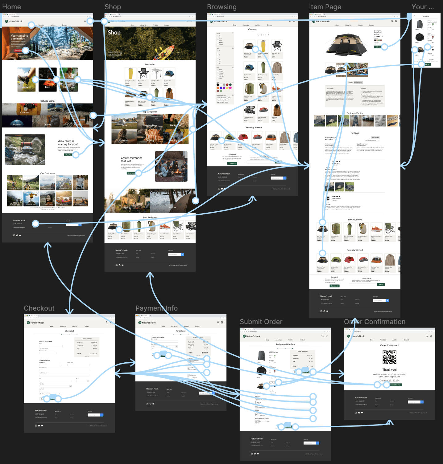 The hi-fi prototype takes the user through the main user flow of purchasing an item and can be tested on desktop, tablet, and mobile size screens. Browse for information and reviews about the black tent, add it to your cart, and complete the checkout experience until you reach the confirmation page.