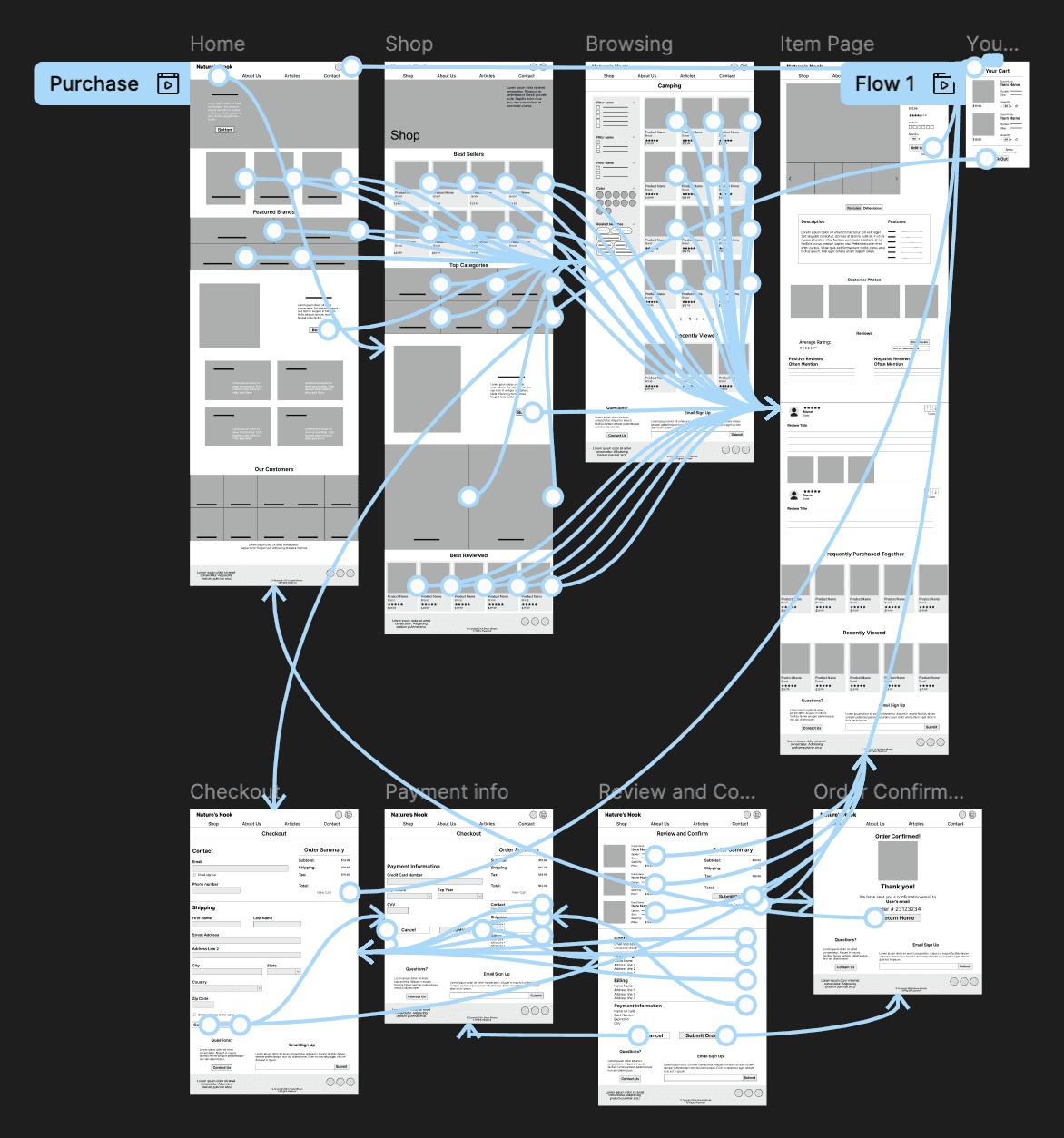 The main user flow is demonstrated in the lo-fi prototype. Add an item to the cart and proceed through the checkout process until you reach the confirmation page.
