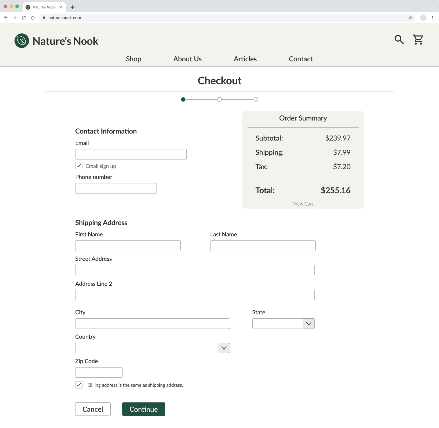After the usability study, I added a subtle progress bar to the checkout process so that the users can tell how long the process is.