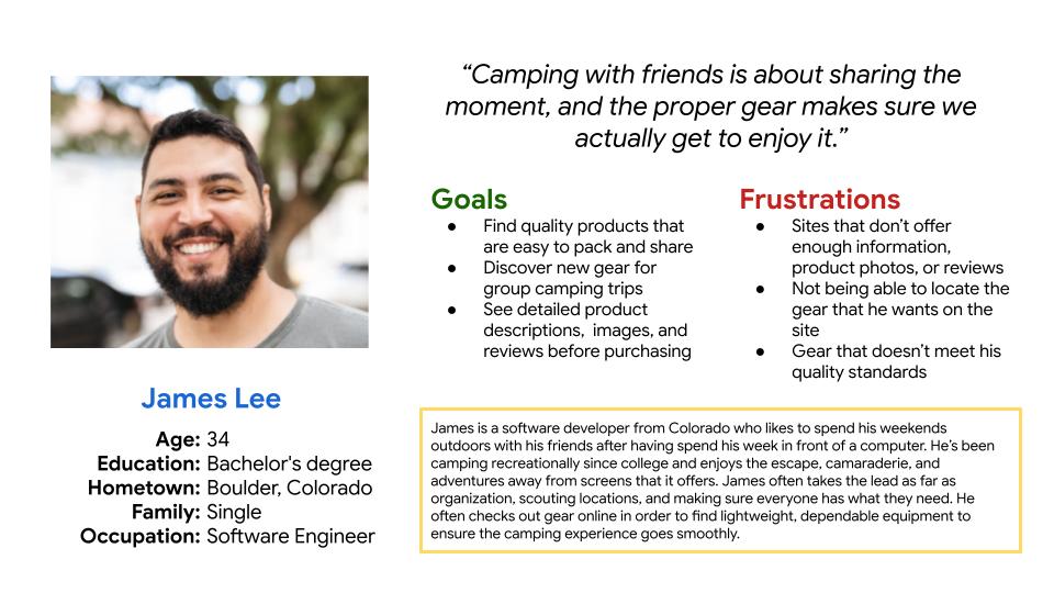 James is a software engineer in his 30’s who needs to see specific and accurate information on camping gear he is buying in order to be certain the gear won’t fail while he is camping with his friends.
