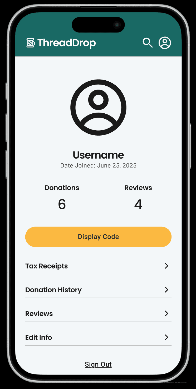 A user profile page was created to help the user access their information, such as their past donation receipts and their history of organizations that they have donated to.