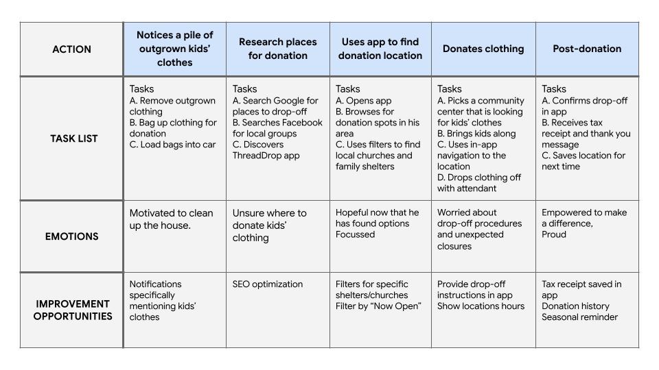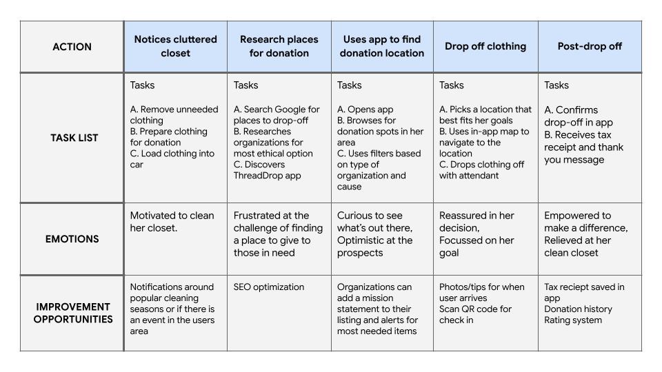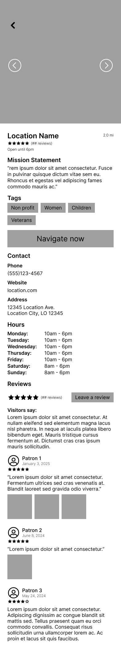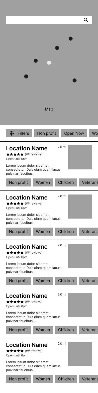 In order to gather information, I conducted user interviews that included participants who donated with varying frequency. I also leveraged the use of AI to efficiently gather statistics about what keeps people from donating, what makes someone decide on a location to donate to, and rates of clothing waste. My findings allowed me to determine insights about my potential user base and develop empathy maps, user personas, and journey maps for those user personas. I also conducted competitor audits, though quickly discovered that the service did not have any direct competitors. To overcome this challenge, I decided that the apps whose basic ideas most closely resemble what I was trying to create were actually apps like Yelp, OpenTable, and Tripadviser with their ability to find restaurants and businesses by their proximity to their user and type of food/service offered.
