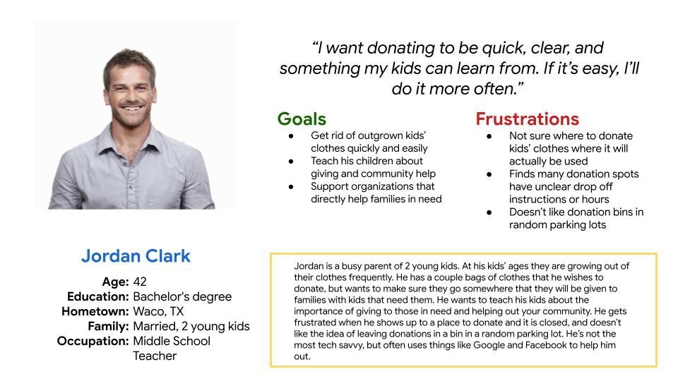 Jordan is a busy father of 2 who needs to find locations with donation hours that fit his schedule because he needs to make space in his home and wants to teach his kids about helping the community.