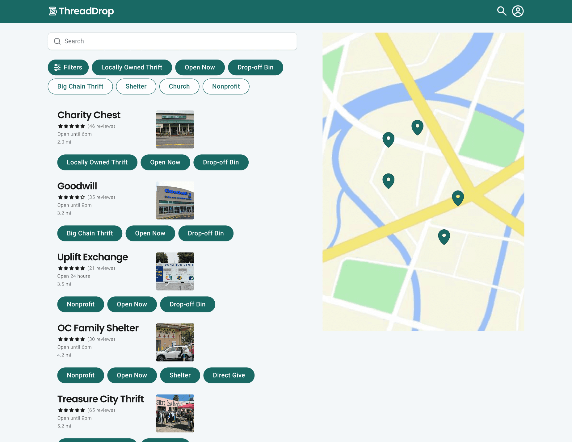 People often want to donate clothing and other items, but have trouble finding convenient locations that align with their values. Without an easy way to find and filter donation options, much needed donations often end up delayed or in the trash.
